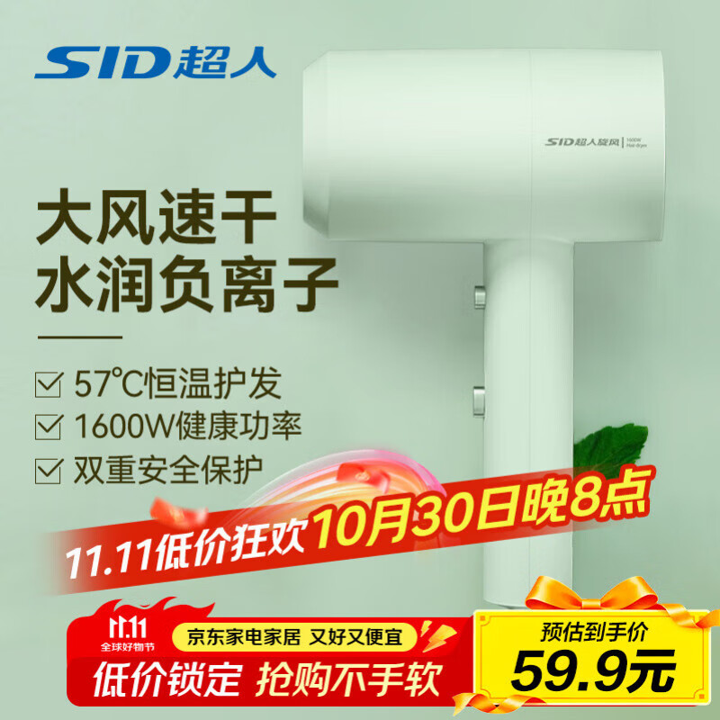 超人(SID)【出行必备】吹风机家用电吹风 3000万负离子大风量速干便携简约吹风筒宿舍学生用电吹风RD1650S