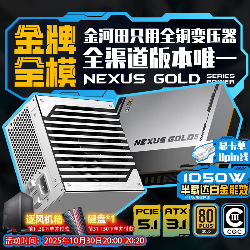 金河田(Golden field)Nexus Gold 1050W 白 ATX3.1台式电脑电源 金牌双认证/12V-2*6/日系主电容/稳压5090D显卡/压纹线