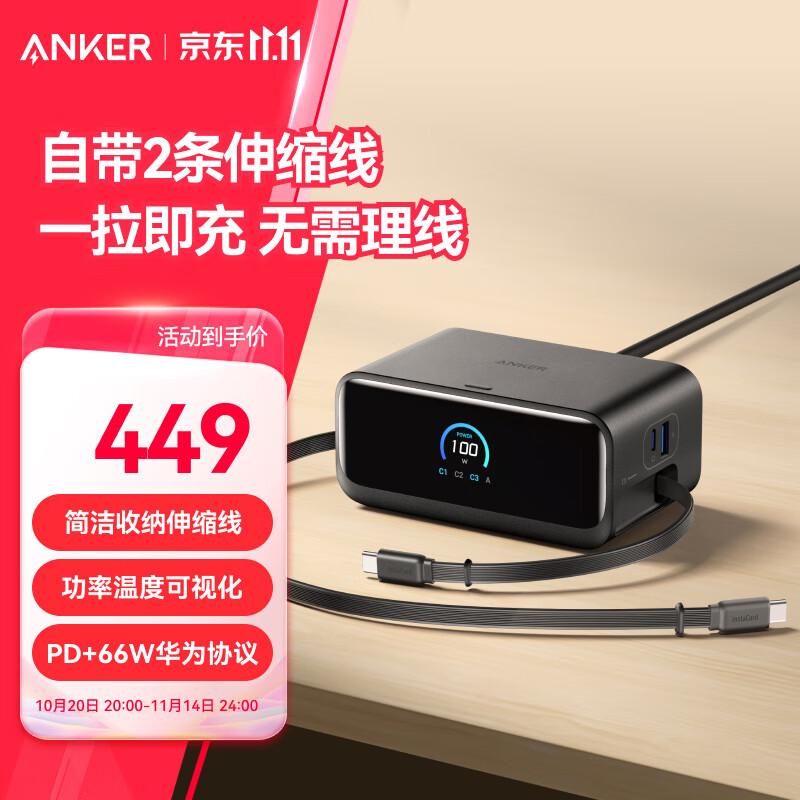 ANKER安克100W桌面充电站mix带伸缩数据线 氮化镓type-c插头充电器适用华为66W快充苹果17iphone16 黑