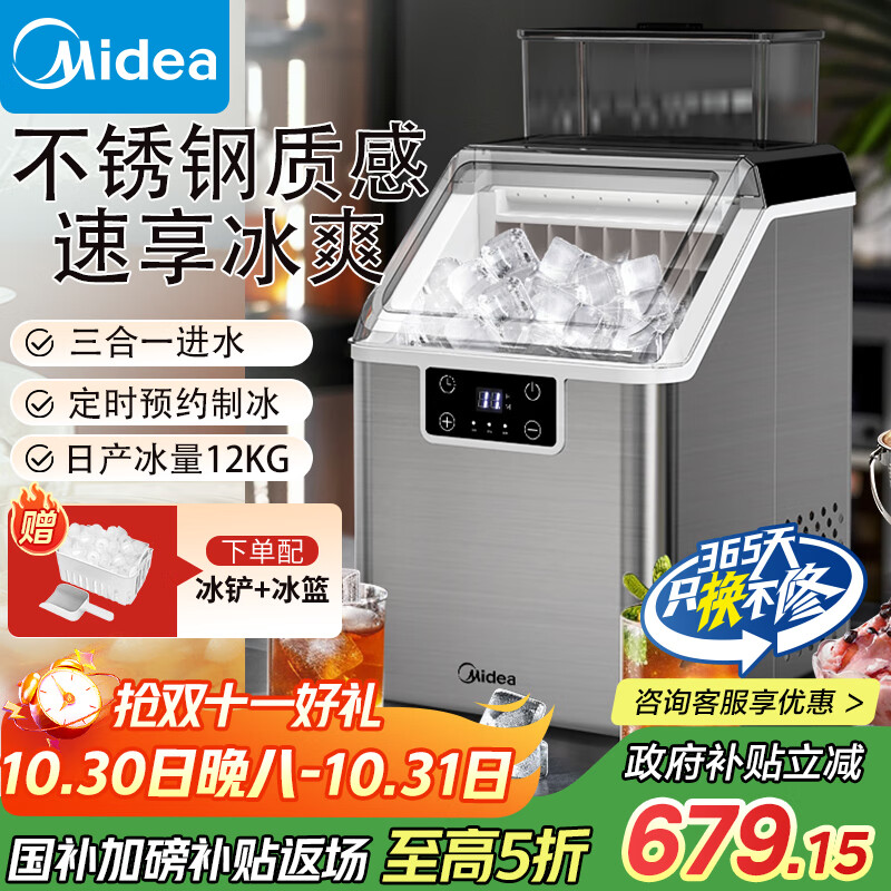 美的(Midea)制冰机 家用方块冰政府补贴不锈钢迷你冰块机宿舍冰魔方自动清洗办公室预约制冰冷饮 MBJ-20F17TE