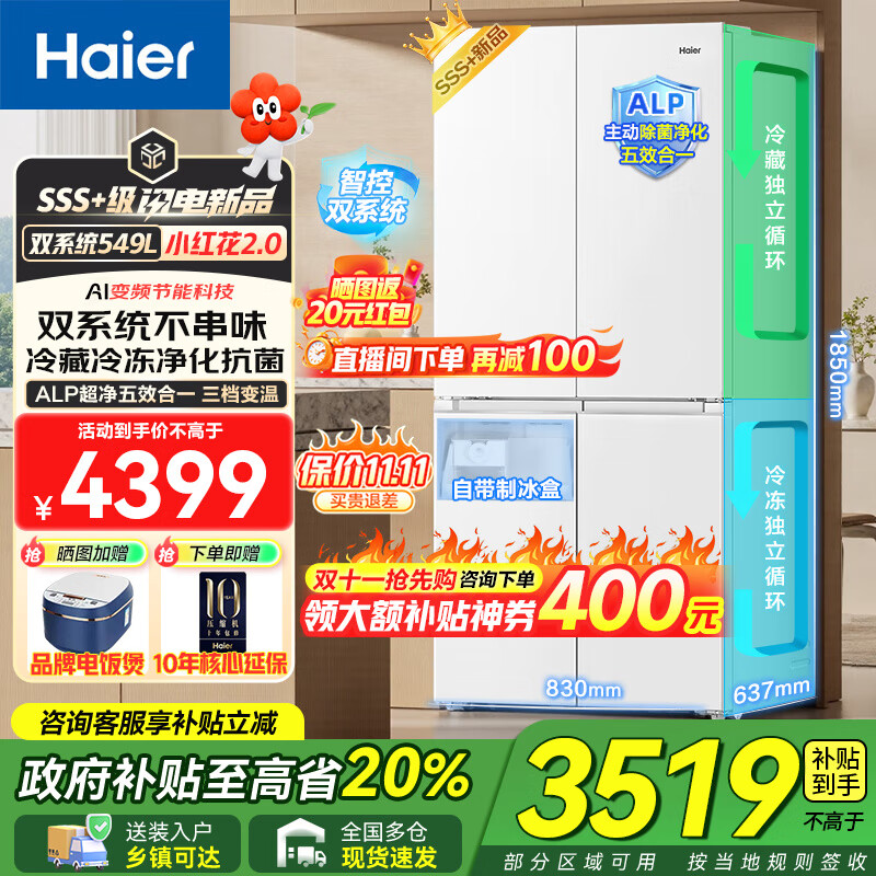 海尔双系统双循环冰箱【新品】549升十字四开门大容量一级能效变频风冷无霜节能家用带制冰国家补贴20% 智控双系统+ALP超净系统+黑金净化+手动制冰机