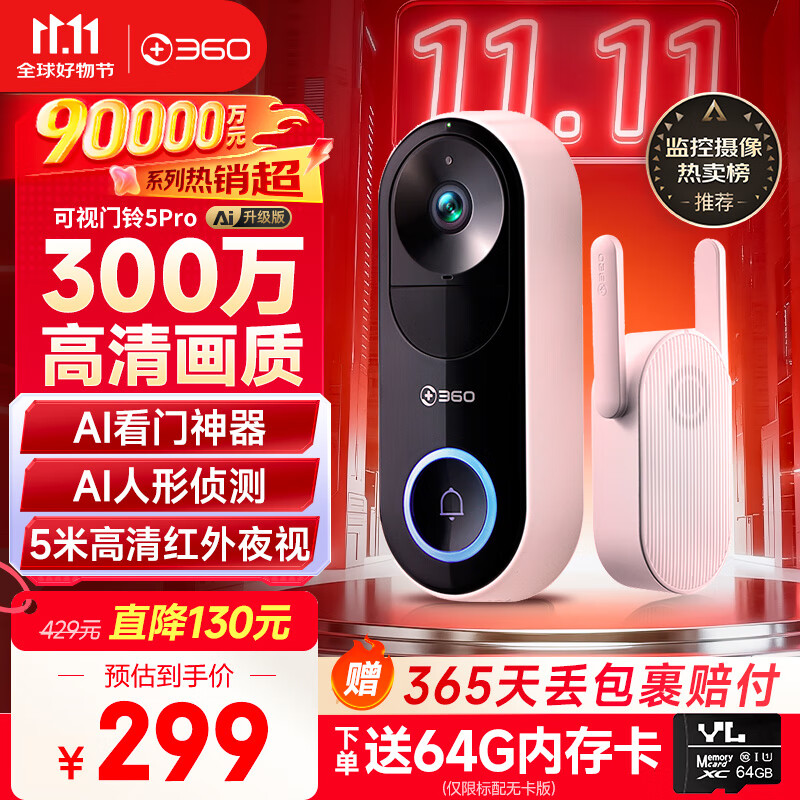 360 可视门铃5Pro摄像头家用监控摄像头智能摄像机2K智能门铃电子猫眼无线wifi 300W超清夜视AR1C