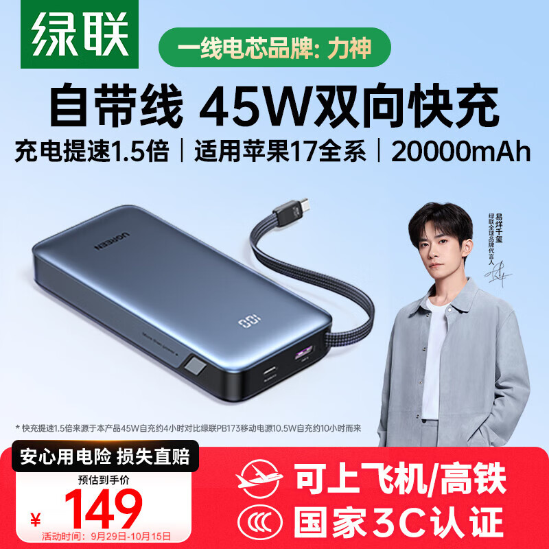 绿联【3C认证可上飞机】超能块iPhone17充电宝自带线20000毫安45W快充 大容量移动电源 适用苹果16小米