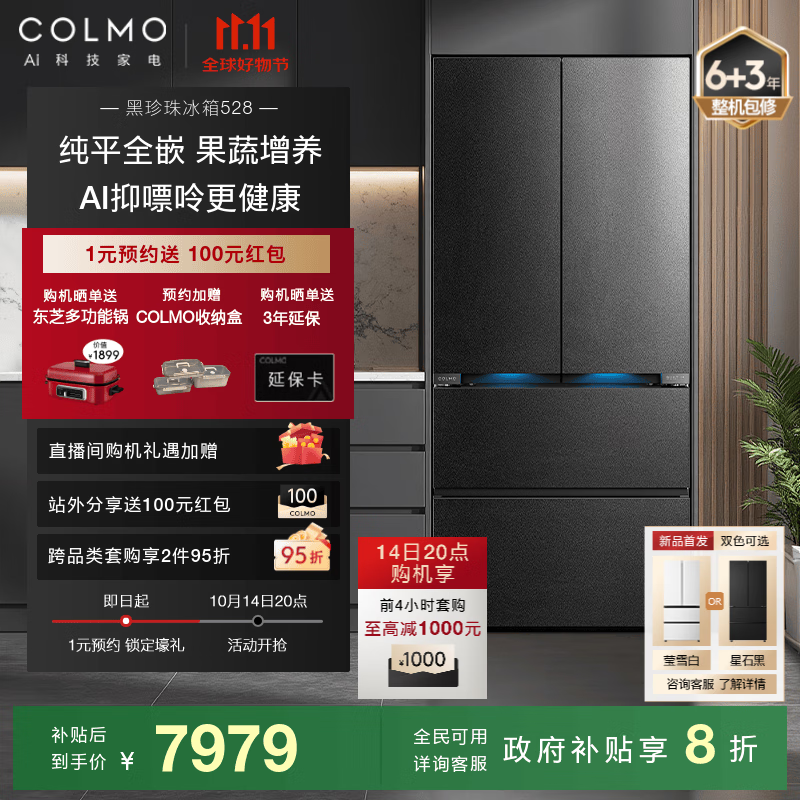 COLMO黑珍珠冰箱528升家用大容量法式四开门60cm超薄纯平全嵌高端冰箱变频风冷无霜 DPS+除菌科技 曜岩黑面板