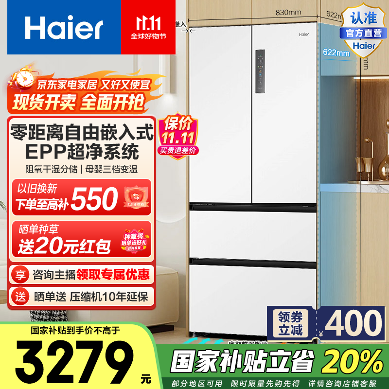 Haier/海尔500升白色零距离自由嵌入式法式双变频风冷无霜一级节能家用电冰箱四开门超薄国家补贴20% BCD-500WGHFD4DW9U1