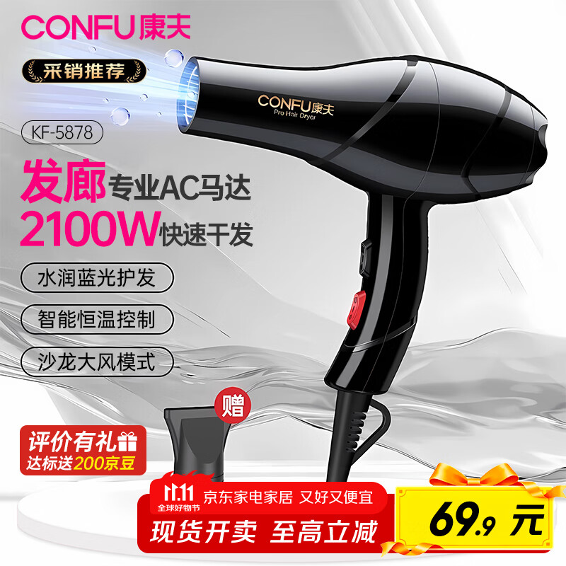 康夫(CONFU)小家电吹风机家用大功率速干发廊专业大风力恒温护发吹风筒送男女友生日礼物节日礼品 5878【经典黑】2100W-发廊专用款