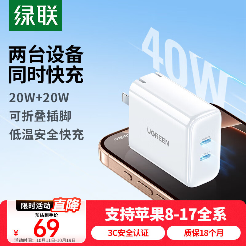 绿联充电器20W快充头适用苹果iPhone17/16e/15/14ProMax多口充电头Type-C插头双口PD40W平板iPad