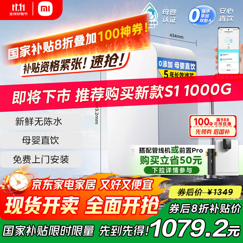米家小米净水器 厨下家用1000G 新鲜无陈水 5年RO反渗透净水机MR1082