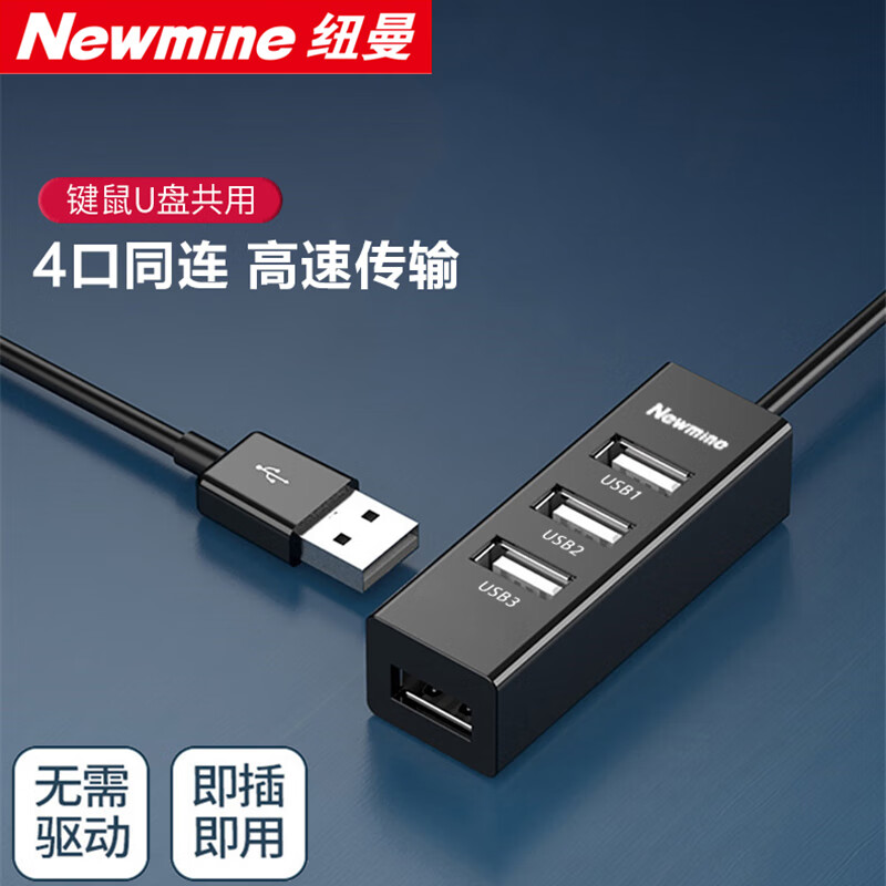 纽曼 usb分线器2.0高速4口HUB集线器 笔记本台式电脑一拖四usb扩展坞延长线转换器约0.25m黑色