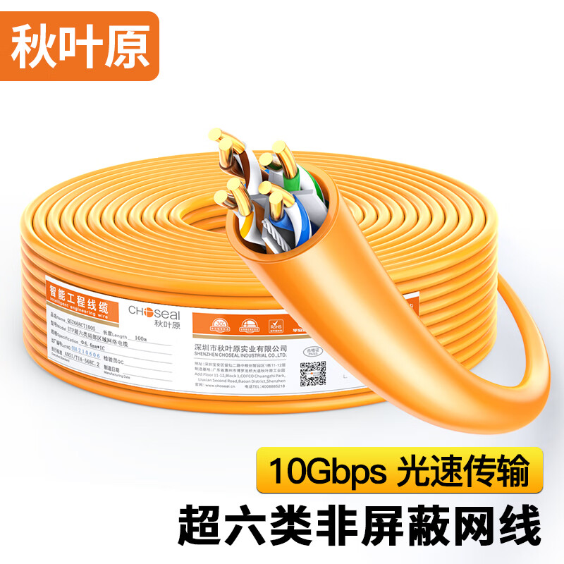 秋叶原(CHOSEAL)原装超六类非屏蔽网线 CAT6A类万兆高速 纯铜线芯 工程家装网络箱线 橙色100米 QS2668CT100S