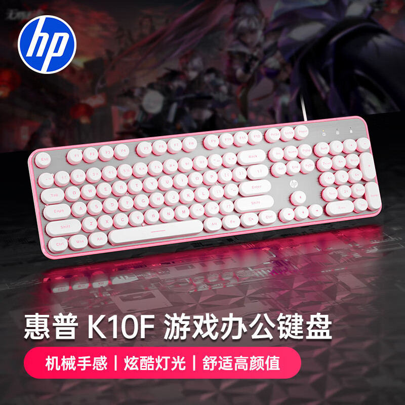 惠普(HP)K10F机械手感键盘 高颜值有线发光游戏办公键盘 舒适耐磨金属面板 26键无冲 白色键帽粉光