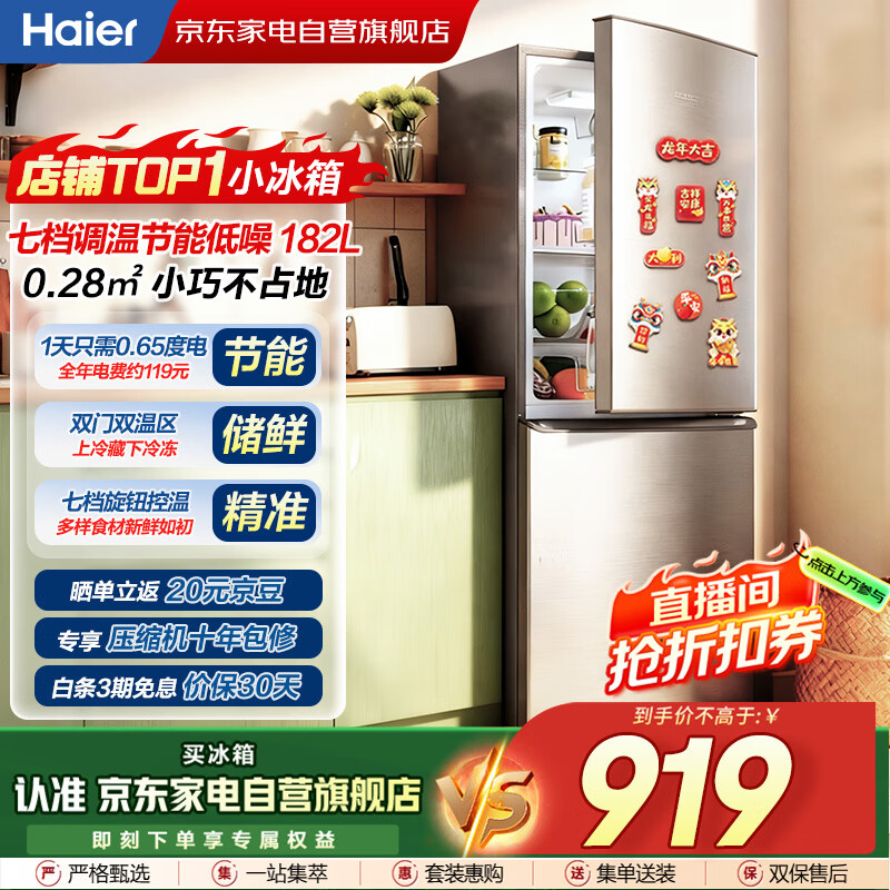 海尔(Haier)冰箱双门小型家用182升冷藏冷冻直冷迷你两门节能电冰箱租房新能效BCD-182LHC2E0YH