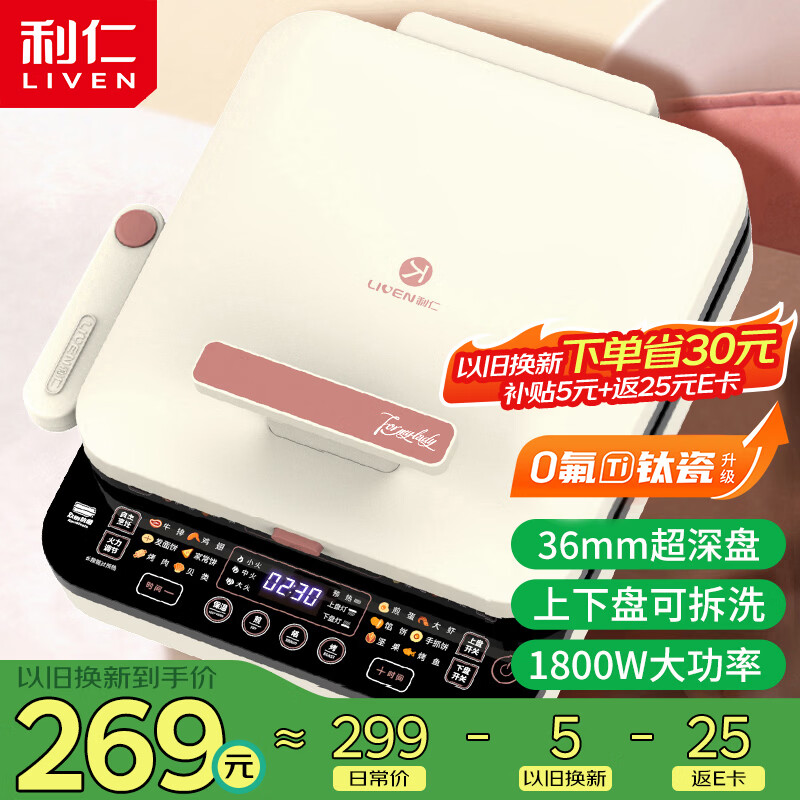 利仁(Liven)0氟钛瓷超耐磨电饼铛上下盘可拆36mm加深家庭用1800W双面加热电饼档三明治早餐机煎饼锅LR-D3529