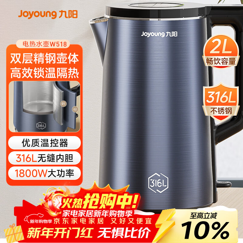 九阳(Joyoung)烧水壶热水壶电水壶2L内外双钢 316L不锈钢一体无缝0胶水 家用开水壶K20FD-W518