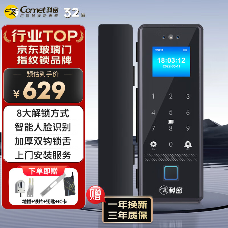科密(comet)人脸识别玻璃门指纹锁门禁电子锁办公室玻璃门锁免开孔 小程序考勤 应急钥匙COM-178包安装