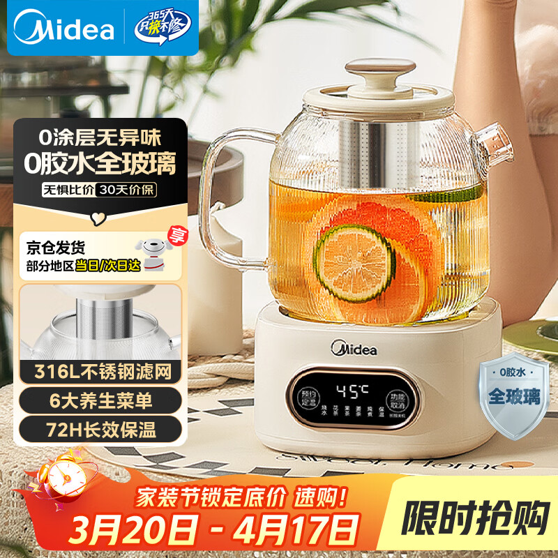 美的(Midea)花漾0胶水全玻璃全自动养生壶 多功能煮茶壶 母婴烧水壶恒温电热水壶煮茶器花茶壶1.2L YS12B102