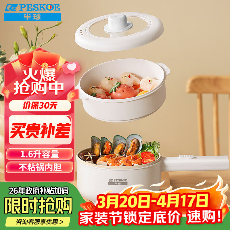 半球(PESKOE)电煮锅 电热锅 1.6L 电炒锅 小电锅 宿舍小锅多功能火锅煮面锅 XL831