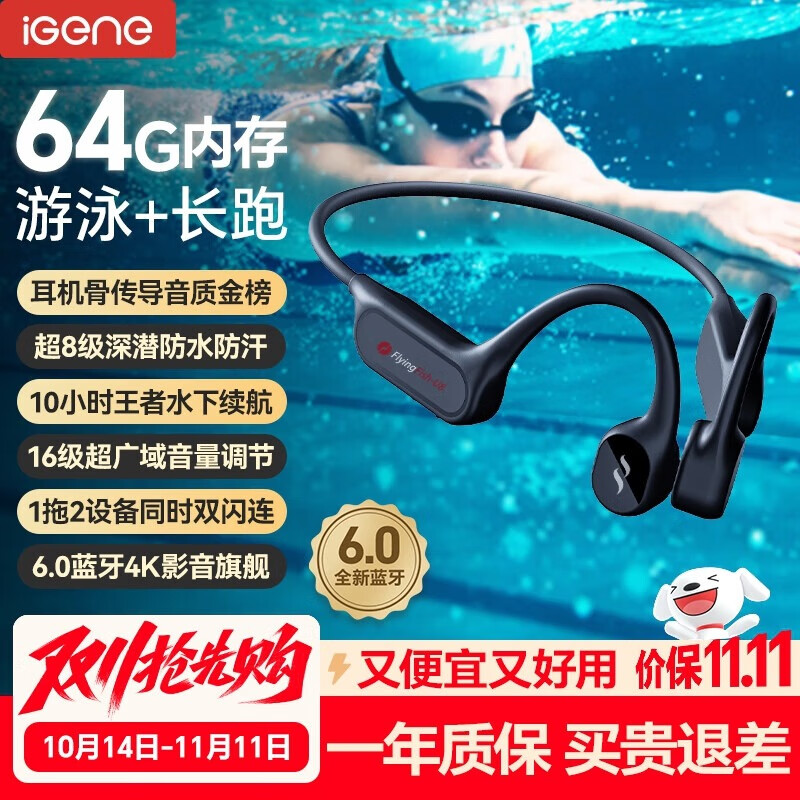 击音【8级防水+64G内存】6.0骨传导蓝牙耳机游泳运动跑步水下一体音乐MP3续航无线挂耳不入耳适用酷狗