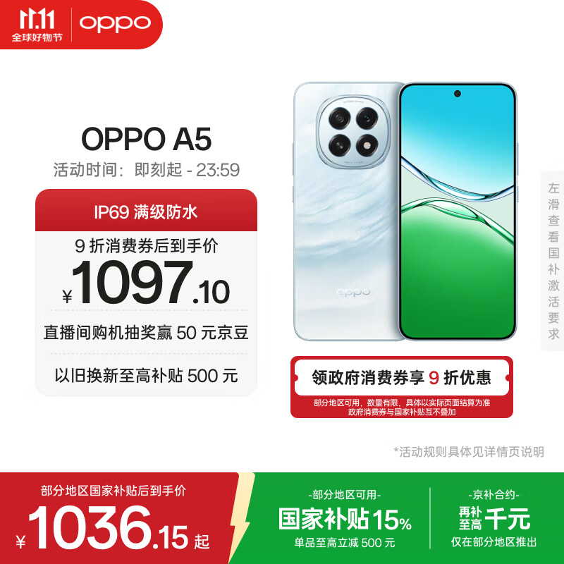 OPPO A5 8GB+256GB 云母蓝 IP69满级防水 360°抗摔 6500mAh耐用大电池 骁龙 5G老人智能手机 国家补贴