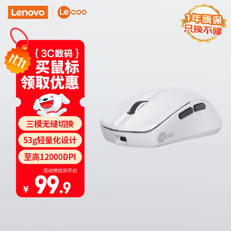 联想(Lenovo)来酷MG201无线蓝牙有线三模鼠标 轻量化电竞游戏鼠标 400mHA电池长时间续航电脑办公 白色