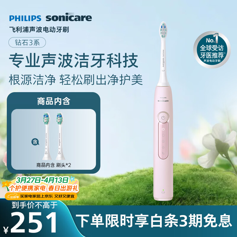 飞利浦(PHILIPS)声波电动牙刷钻石3系 生日礼物 情侣送男生/女友 微泡水流 HX5171/04淡粉色