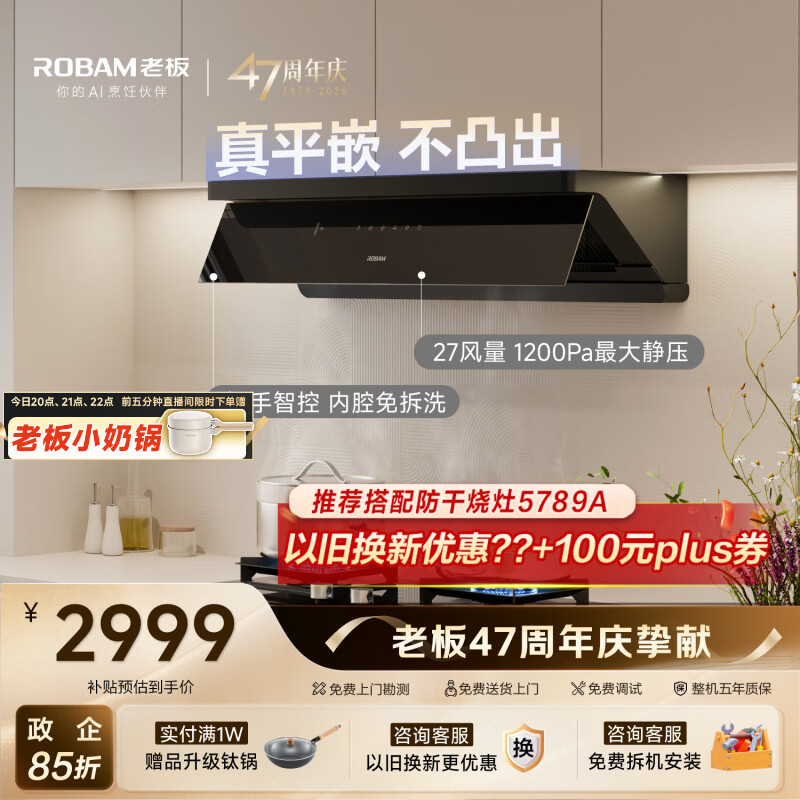 老板【超薄平嵌小黑镜L1】家用抽吸排油烟机27风量顶侧一体免拆洗以旧换新上门安装大吸力静音政府补贴