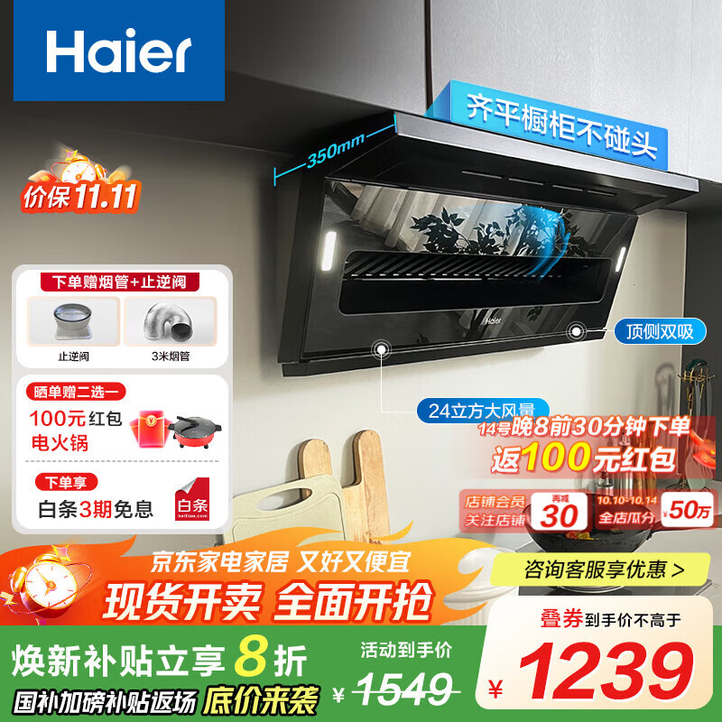 海尔(Haier)【补贴20%】抽油烟机 七字型超薄顶侧双吸 大五口速吸烟机 24立方风量大吸力480pa 免拆机热熔自清 【51单烟机】超薄顶侧双吸自清洁烟机