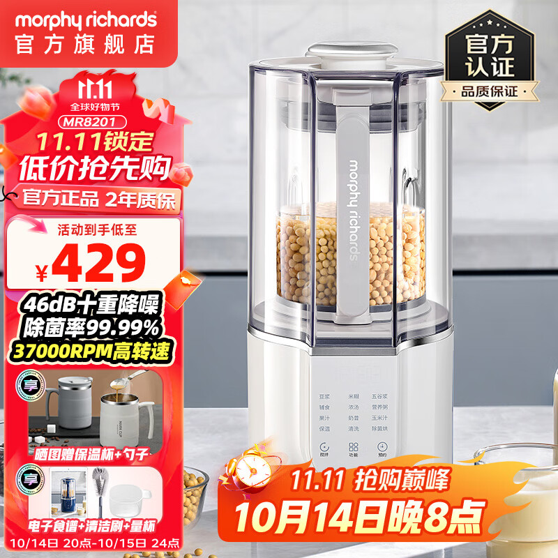 摩飞电器(Morphyrichards)柔音破壁机家用豆浆机轻音全自动1.5L大容量多功能料理机十重降噪自动清洗定时预约免滤无渣MR8201 椰奶白