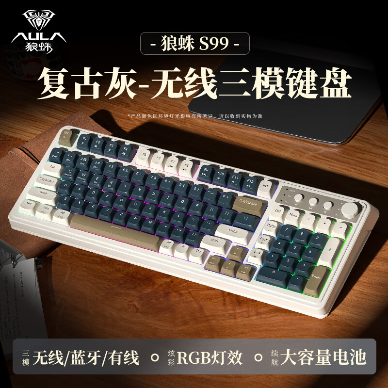 狼蛛(AULA)S99无线蓝牙有线三模键盘机械手感RGB背光拼色静音键盘鼠标套装mac电脑键盘 复古灰【三模/RGB】