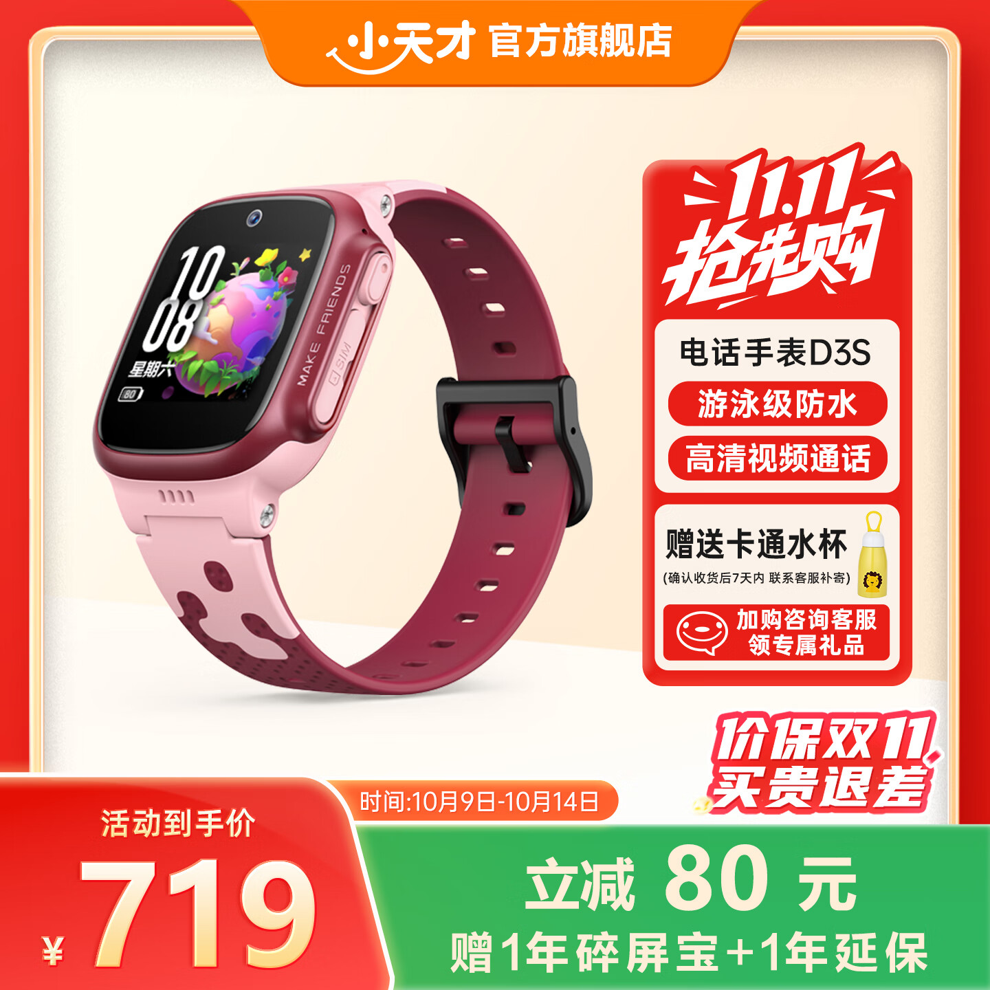 小天才 儿童电话手表D3S 楼层定位历史轨迹实时状态运动游泳级防水 4G全网通视频通话小学初高中男孩女孩 D3S绯云红【咨询客服享好礼】