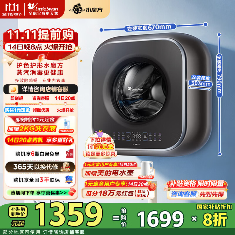 小天鹅(LittleSwan)3公斤壁挂洗衣机 母婴儿童宝宝内衣高温煮洗蒸汽除菌水魔方【小海绵2.0轻奢版】 一级能效家电国家 TG30M60【小海绵2.0 轻享版】