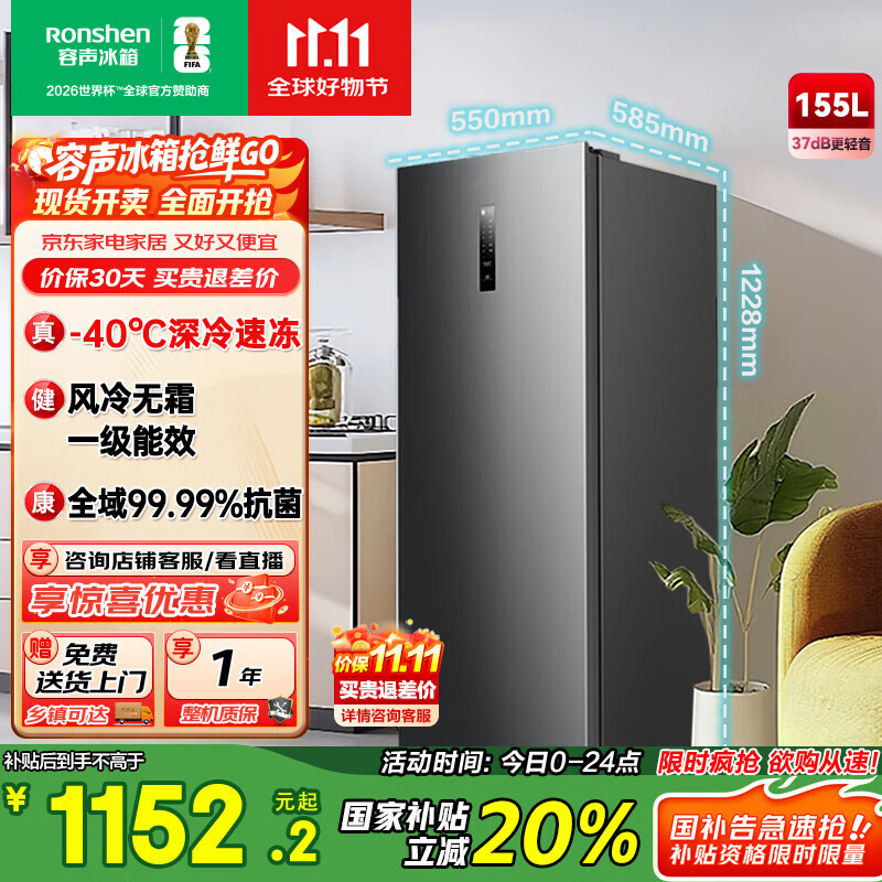容声155升立式冰柜一级能效风冷无霜除菌净味母乳冷藏冷冻抽屉式冷柜 以旧换新BD-155WRSY国家补贴20% 墨韵灰 155L
