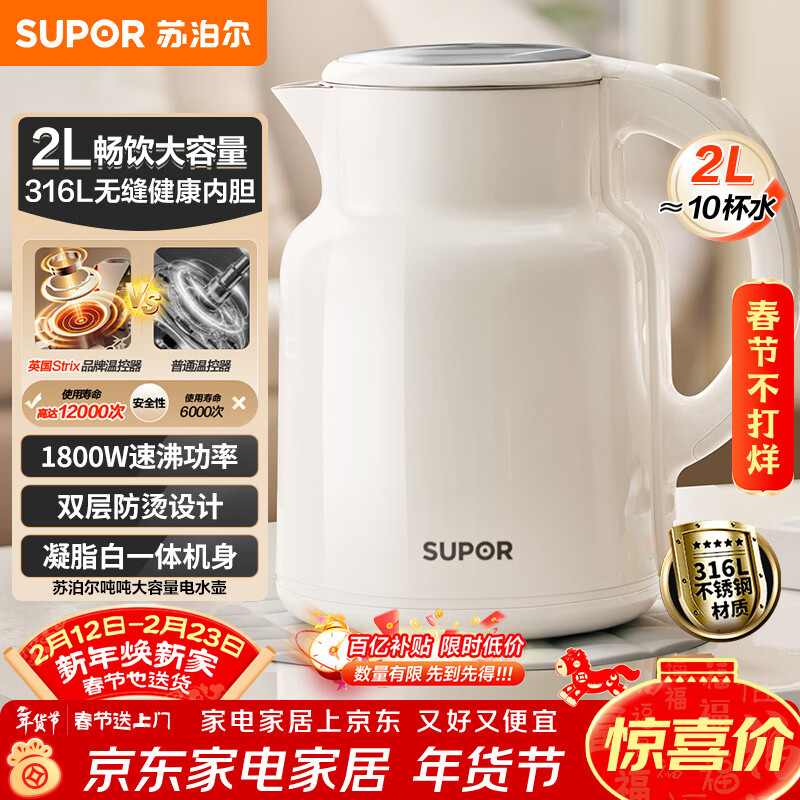 苏泊尔(SUPOR)吨吨大容量电水壶烧水壶 2L大容量 全钢无缝电热水壶 316L不锈钢热水壶 SW-20T06L