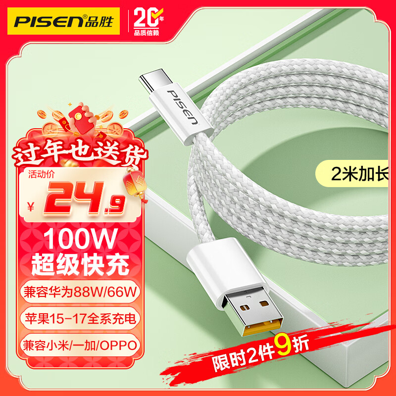品胜type-c数据线100W/66W快充6a苹果17/16/15充电线适用华为Mate80/P70荣耀小米手机平板车载编织2米
