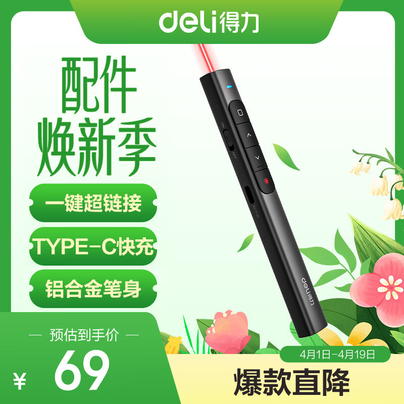 得力(deli)红光激光笔 翻页笔教师用演讲笔 PPT翻页笔 投影笔激光翻页笔极速快充 无线演示 黑色MA120