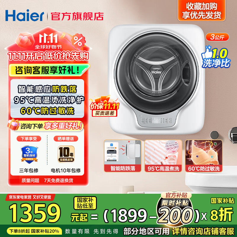 海尔(Haier)壁挂洗衣机3公斤【国家补贴 · 母婴级除菌防过敏】全自动迷你洗衣机内裤内衣婴儿 一级能效 【ALT智能防跌落】95℃高温杀菌+专属防过敏洗