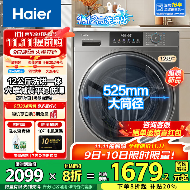 海尔洗衣机12公斤滚筒大容量家用洗衣机大筒径超薄机身除菌螨一级能效L50DS洗衣机全自动国家补贴20% 12公斤洗烘一体:525大筒径+1.12高洗净比
