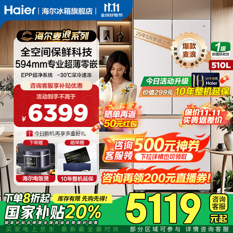 海尔(Haier)麦浪冰箱510升全空间保鲜594mm专业超薄零嵌 四门法式多门EPP超净一级能效双变频大容量家用电冰箱 510升麦浪+594超薄嵌+全空间保鲜+EPP超净