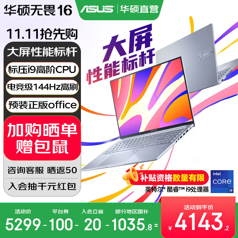 华硕无畏16【国家补贴20%】高性能轻薄笔记本电脑 酷睿i9-13900H 16G 1T 2.5K屏 银色144Hz高刷【预装Office版】