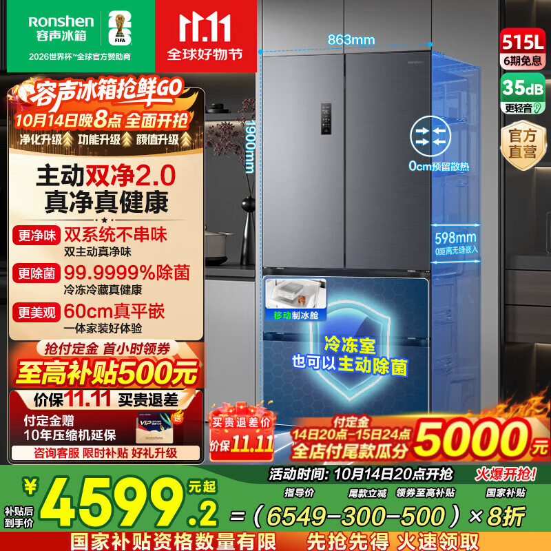 容声方糖515主动双净双系统法式多门四开门超薄零嵌入式电冰箱制冰一级能效BCD-515P60FZMAD灰国家补贴 BCD-515P60FZMAD灰国家补贴