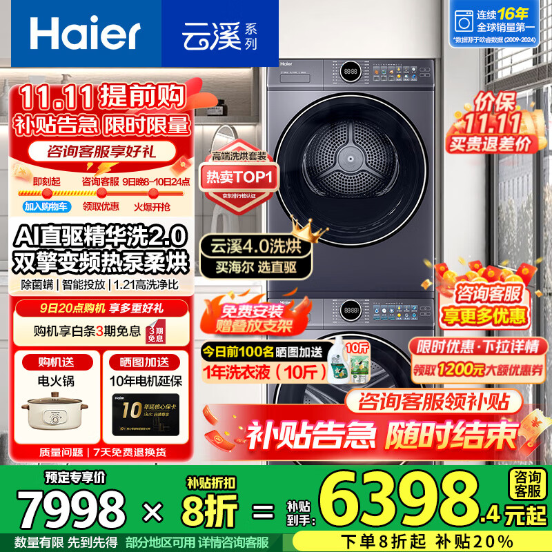 海尔(Haier)海尔【云溪4.0】77E洗烘套装滚筒全自动洗衣机烘干机组合洗烘一体机直驱精华洗2.0热泵烘干羊毛蓝标 77E洗烘套装|直驱精华洗1.21洗净比+热泵烘干