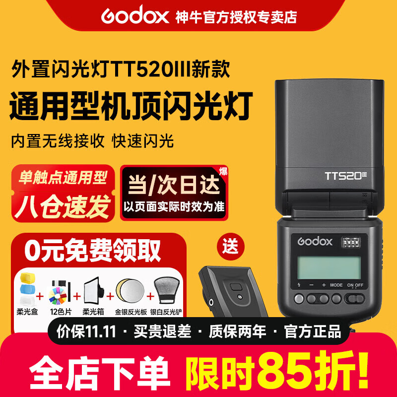 神牛tt520III三代闪光灯摄影补光灯拍摄专用便携相机单反机顶闪光灯外置离机热靴佳能富士索尼尼康通用 【JD物流】TT520III三代 <热销> 官方标配(送引闪器)