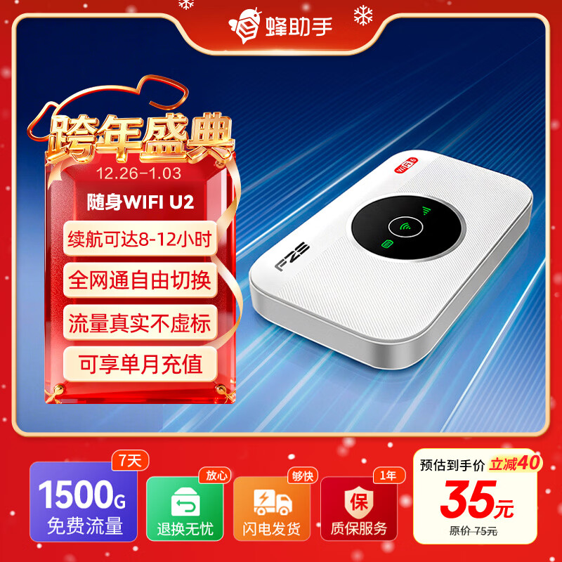 蜂助手新款随身WiFi U2(4G版) 无线上网 WiFi6三网通免插卡4G路由器随身便携3000毫安大电池超长续航 【送1500G*7天流量】