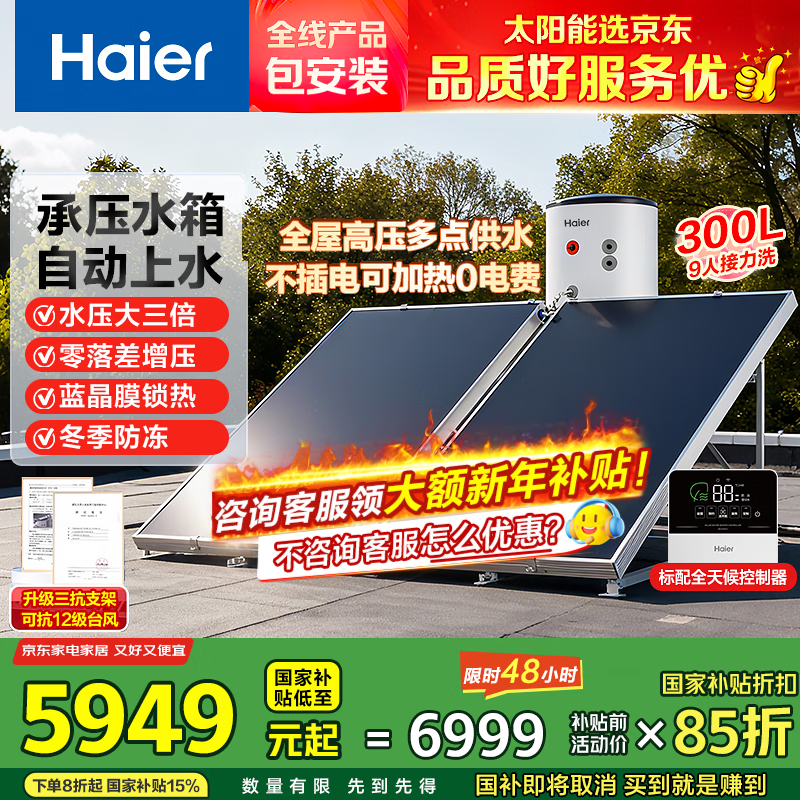 海尔(Haier)国家补贴高压供水承压平板式高端太阳能电热水器光电两用 一级能效家用自动上水大容量智能省电 300升PD3咨询领券/全新承压式水箱/光电两用