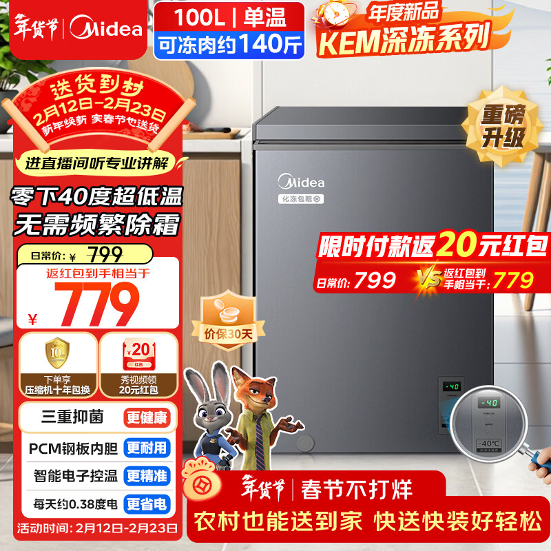 美的(Midea)深冻系列100L单温家用冰柜零下40度超低温小型冷柜冷冻柜冷藏柜卧式冰箱BD/BC-100KEM(E)国家补贴