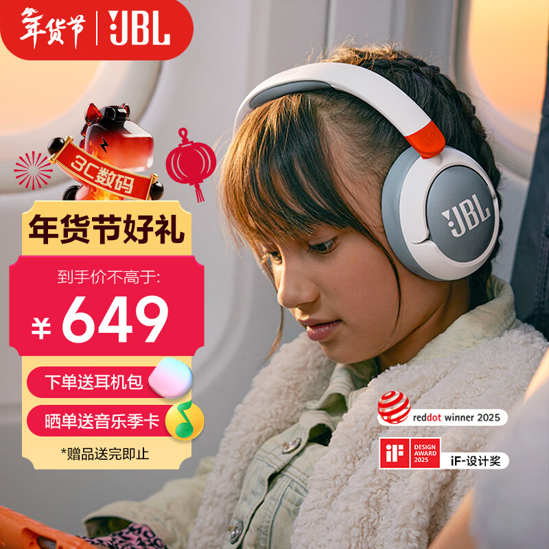 JBL JR470NC 头戴式蓝牙儿童耳机 主动降噪真无线沉浸式学习网课益智背书APP控制 儿童新年礼物 白色
