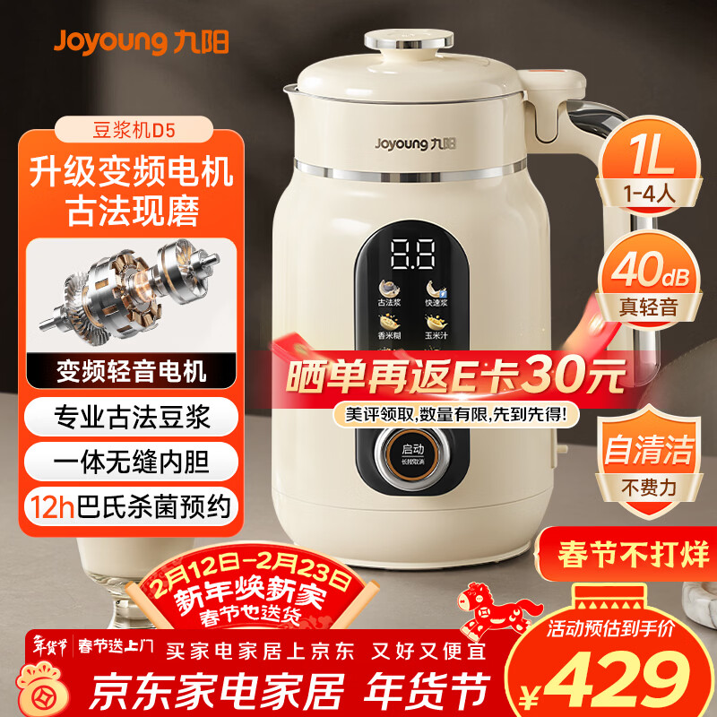 九阳25年新款1L豆浆机变频轻音1-4人用古法浆免过滤自清洁家用全自动多功能榨汁破壁机D5
