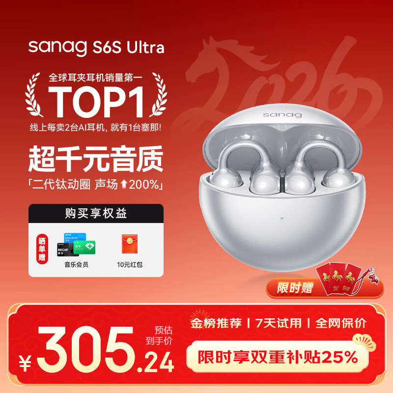 SANAG塞那S6S Ultra【补贴立减15%】蓝牙耳机耳夹式气骨传导概念开放式不入耳运动挂耳式无线AI翻译机