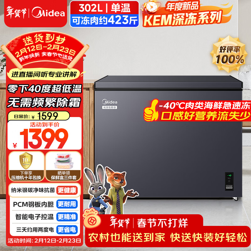 美的(Midea)深冻系列300L单温家用冰柜零下40度超低温冷柜无需频繁除霜冷冻柜冷藏柜冰箱BD/BC-302KEM国家补贴