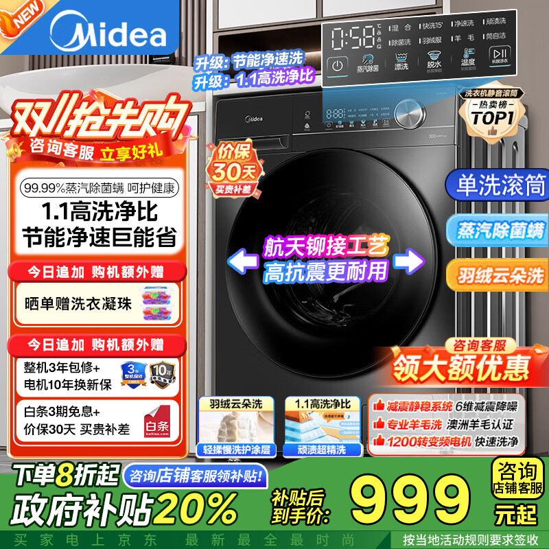 美的(Midea)全自动变频家用洗衣机10公斤滚筒超薄大容量一级能效除菌除螨节能1.1高洗净比以旧换新国家补贴20% 行业热卖爆款|10公斤|单洗MG100V36T